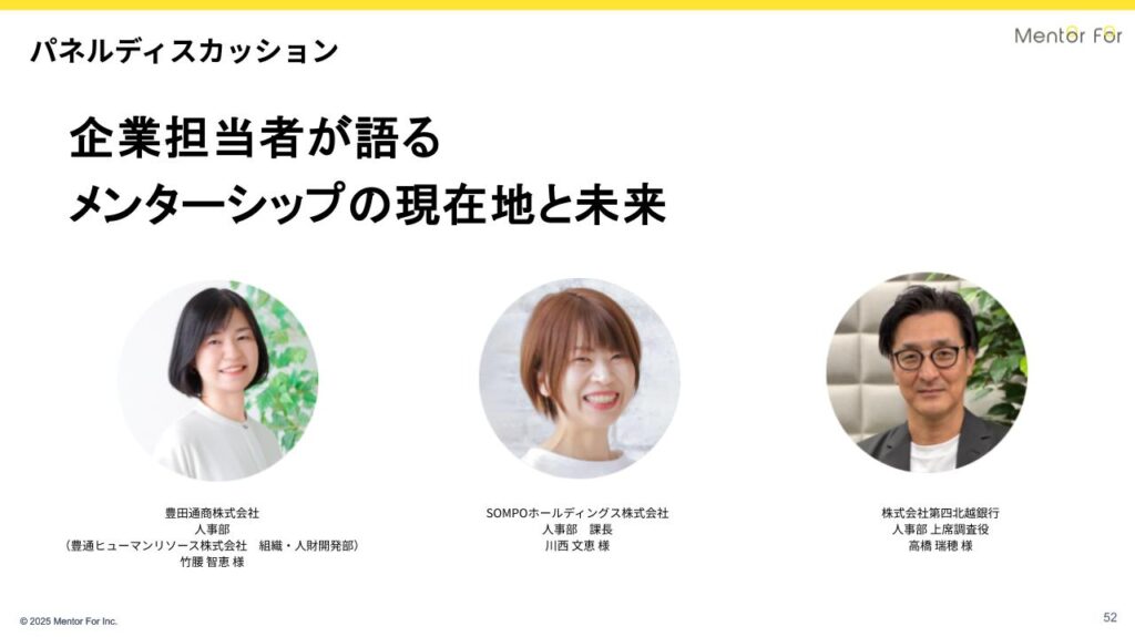 第2部は、Mentor Forのプログラムを導入・実践している企業の人事担当者をお招きし、「企業担当者が語る、メンターシップの現在地と未来」をテーマに、60分のディスカッションをおこないました。