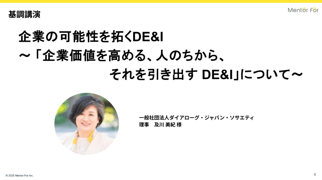 人や組織を良くしたいと、日々葛藤しながらDE&I推進に取り組んでいらっしゃる皆さんと、こうして一堂にお会いできたことをとても心強く感じています。Mentor Forは、メンター屋さんや研修屋さんではなく、皆さんのように現場で踏ん張る方々の「パートナー」でありたいと、あらためて思いました。