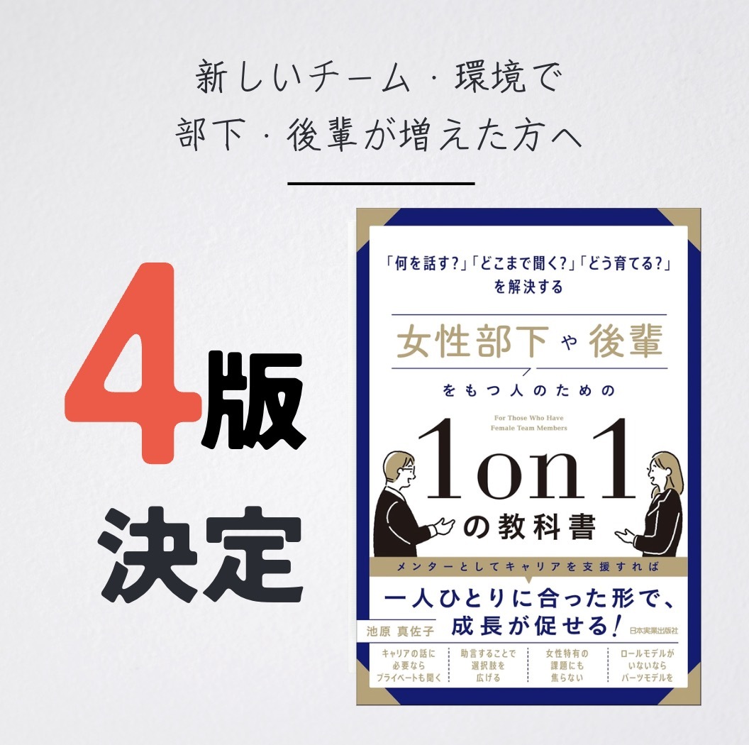代表・池原の著書『女性部下や後輩をもつ人のための1on1の教科書』(日本実業出版社)の増刷(4刷)が決定いたしました!